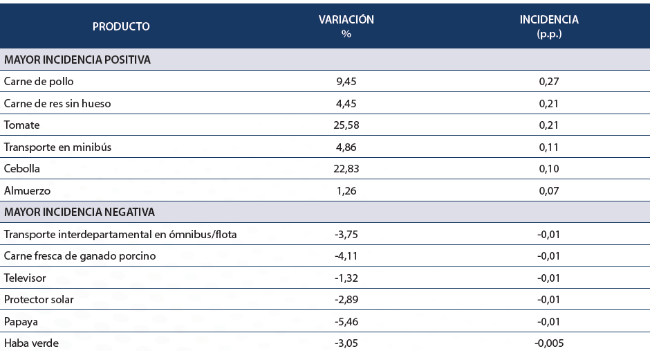 Si bien existieron algunos bienes y servicios que presentaron variación negativa en el mes de marzo, como ser el Transporte interdepartamental en ómnibus/flota, la Carne fresca de ganado porcino, entre otros, la incidencia de los mismos es relativamente baja en relación a las variaciones positivas observadas.