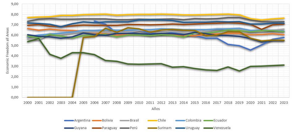 Figura N°3: Evolución del índice de libertad económica en Sudamérica, 2020 – 2023