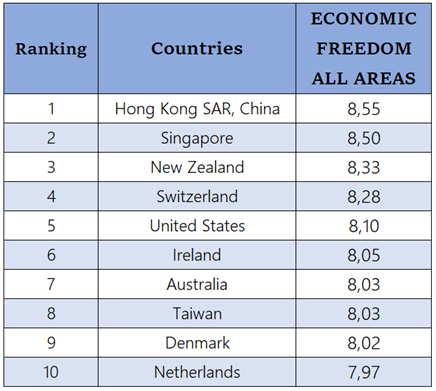 Figura N°1: Ranking mundial de libertad económica – Top 10 países, 2023