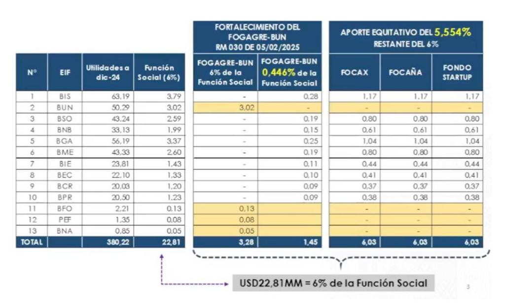 Para la determinación del monto de la función social, una vez auditados los estados financieros, las utilidades netas de los Bancos Múltiples y PYME asciende a 380,22 millones de dólares, por lo que, en cumplimiento al D.S. N° 5306, el 6% de las utilidades netas destinado a la función social corresponde a 22,81 millones de dólares.