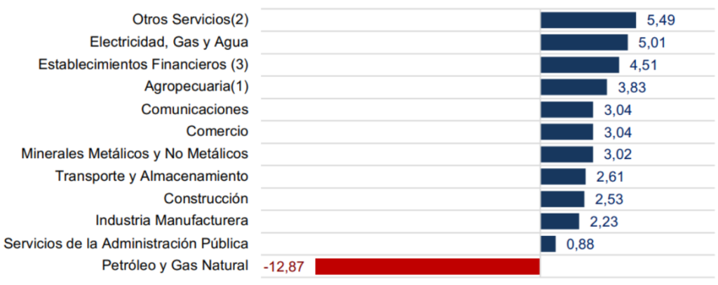 A nivel de actividades económicas, aquellas que tuvieron mayor variación positiva sobre el crecimiento del PIB fueron: Otros Servicios, Electricidad, Gas y Agua y, Establecimientos Financieros. En el primer caso, la variación fue del 5,49%, influenciado principalmente por el gran desempeño de la actividad de servicios comunales, sociales y personales que presentó una variación del 6,47%. Por su parte, el sector de Electricidad, Gas y Agua presentó una variación del 5,01%, el cual estuvo vinculado al crecimiento observado en el valor bruto de la producción de generación de energía eléctrica, que, presentó un crecimiento del 5,63%. Finalmente, entre las actividades con mayor participación positiva se encuentran los Establecimientos Financieros con un crecimiento del 4,51%, donde la principal actividad fueron los servicios financieros con un crecimiento del 5,26%.