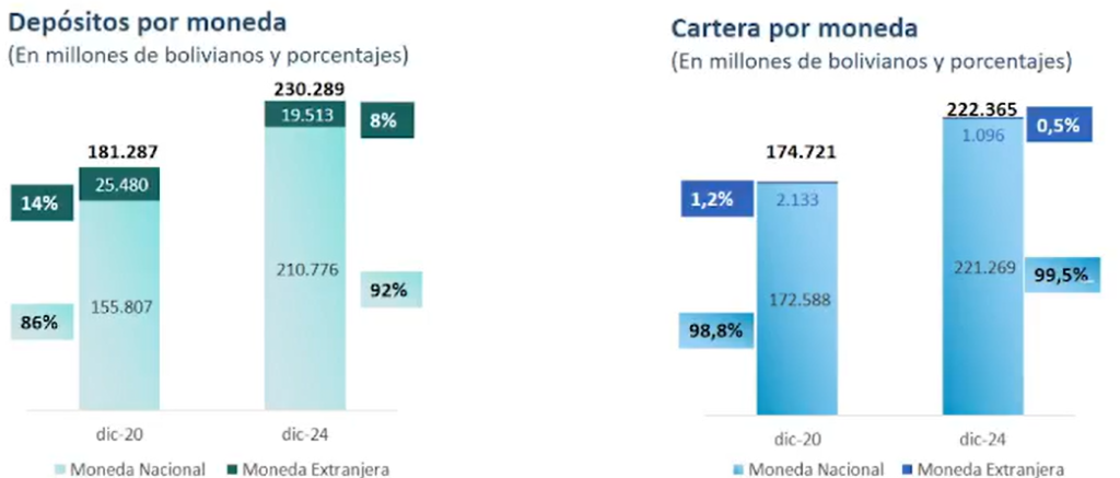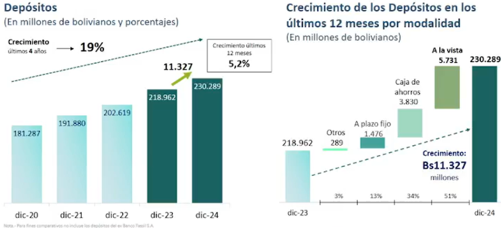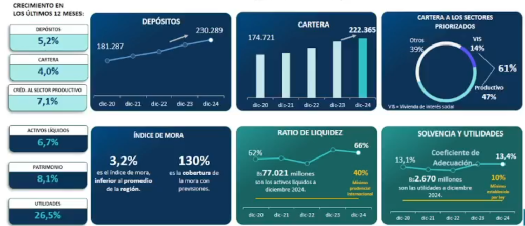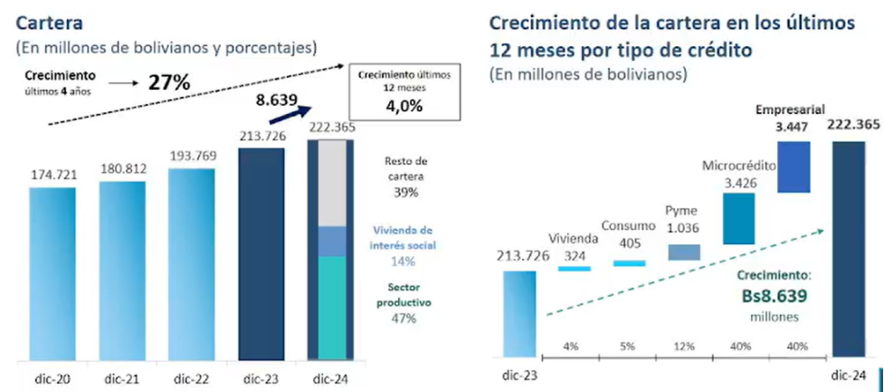 En cuanto a la cartera, se observa un crecimiento de 8.639 millones de bolivianos, que representa una variación del 4% en relación a diciembre de 2023, alcanzando así un monto total de cartera de 222.365 millones de bolivianos.