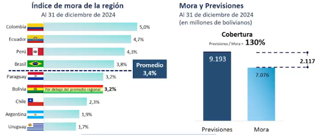 La gestión 2023 el índice de mora cerró en 2,9%. Al cierre de la gestión 2024, el índice de mora presentó un ligero incremento en relación a la gestión 2023, situándose en 3,2%. Dicho valor al cierre de la gestión 2024, es el valor más alto desde la gestión 2009, lo que nos quiere mostrar, un deterioro en la capacidad de pago de los prestatarios, que, está ligado al desempeño económico del país. Sin embargo, el índice nacional aún se encuentra mínimamente por debajo del promedio de la región.