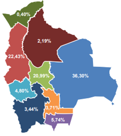 Analizando la composición del parque automotor según departamento, el 36% se encuentra en Santa Cruz, el 22% en La Paz y el 21% en Cochabamba, esto quiere decir que, el 79% del parque automotor nacional se encuentra en el eje troncal del país. El restante 11% se encuentra distribuido en los otros departamentos.
