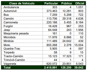 Asimismo, si se analiza el parque automotor según la clase de vehículos, se tiene que, el 93% es de uso particular, destacando principalmente las motos, vagonetas, automóviles y camionetas; el 5% corresponde uso público, donde se destacan los camiones, minibús y vagonetas y, finalmente, el 2% corresponde a vehículos de uso oficial.
