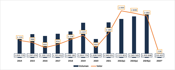 Gráfico N° 1: Importación de Combustibles 2014 – 2025 (en millones de dólares y toneladas)