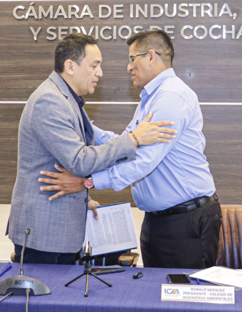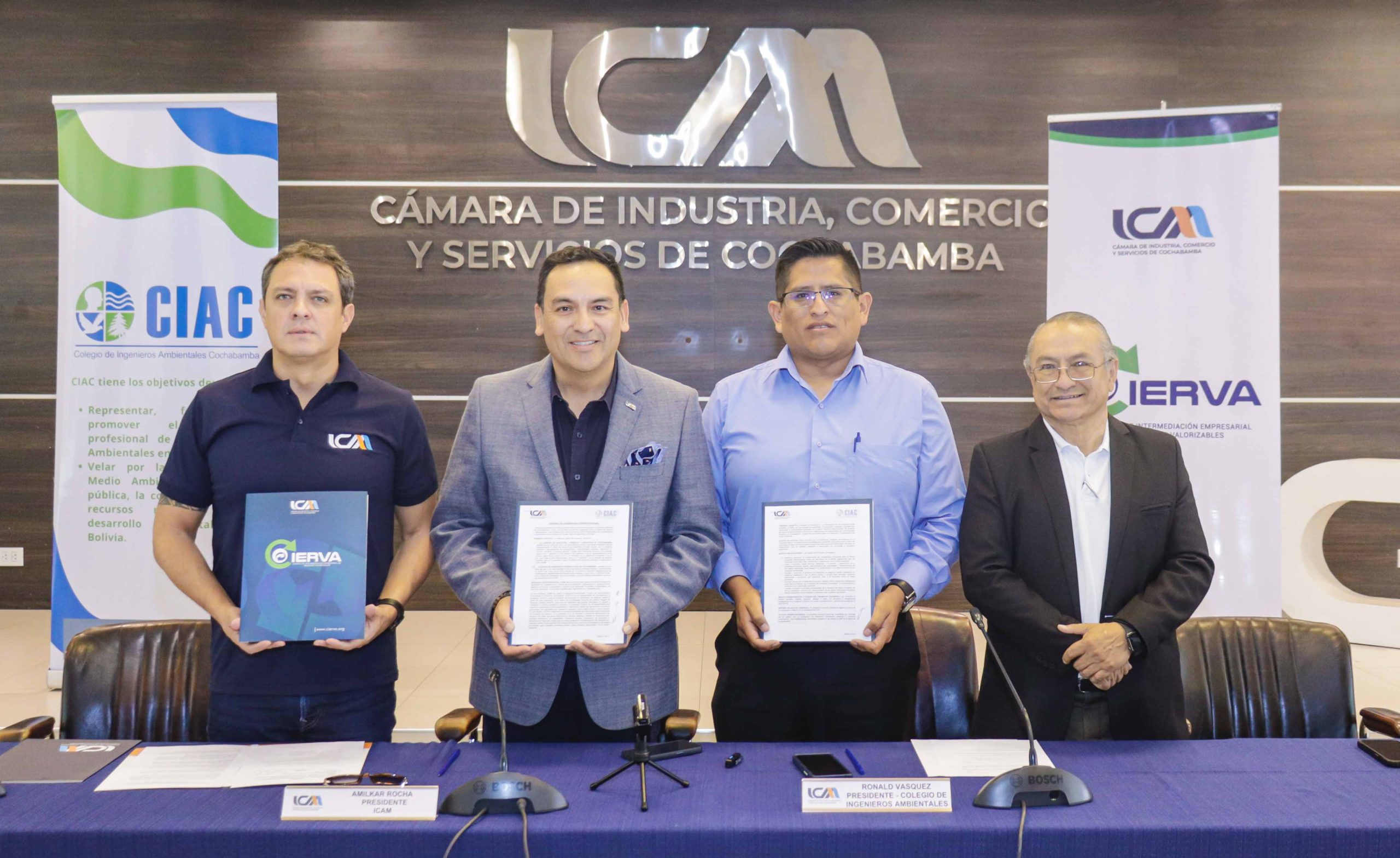 Hoy se llevó a cabo la firma de un convenio de cooperación interinstitucional entre la Cámara de Industria, Comercio y Servicios de Cochabamba (ICAM) y el Colegio de Ingenieros Ambientales de Cochabamba (CIAC), con el objetivo de promover acciones conjuntas a favor de la sostenibilidad ambiental en el sector industrial manufacturero.