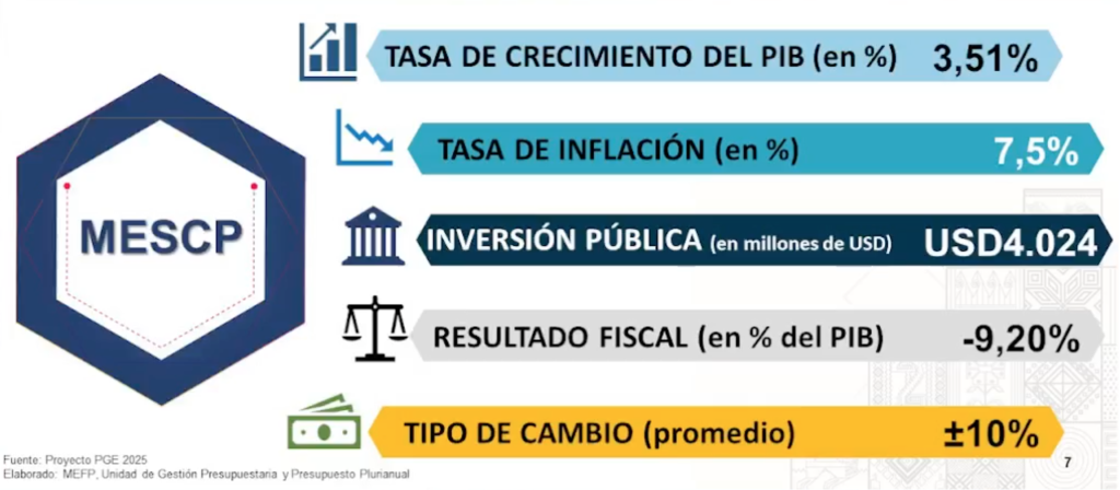 En ese sentido, se prevé un crecimiento del Producto Interno Bruto (PIB) de 3,51% para 2025, una tasa de inflación del 7,5% (superior a la meta de 2024, la cual se encuentra acorde a la realidad económica del país), nuevamente un déficit fiscal en el orden de 9,20% del PIB y, como todos los años, la posibilidad de variación +/- 10 puntos porcentuales en el tipo de cambio.