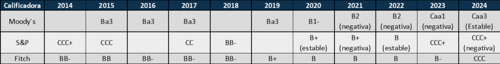 La calificadora Moody´s bajó la calificación del país a en Caa3(estable), una calificación peor a la que se tuvo en la gestión 2023; la calificadora S&P disminuyó la calificación, pasando de CCC+ a CCC+ (negativa) y, la calificadora Fitch disminuyó la misma a CCC. Estas calificaciones y una disminución observada en la presente gestión, dificultan el acceso al financiamiento externo dado que, dichas calificaciones corresponden al pago de una tasa de interés mucho más alta, hoy en día, se estaría hablando de una tasa por encima del 18%.