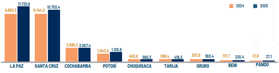 Durante el período analizado, el eje central del Estado Plurinacional de Bolivia integrado por los departamentos de La Paz, Santa Cruz y Cochabamba, concentró el 90,5% de los ingresos tributarios obtenidos del Mercado Interno. La recaudación en estas tres regiones experimentó un crecimiento del 19,2% respecto al mismo periodo de 2024, reafirmando su papel como el principal motor de generación de recursos fiscales a nivel nacional.