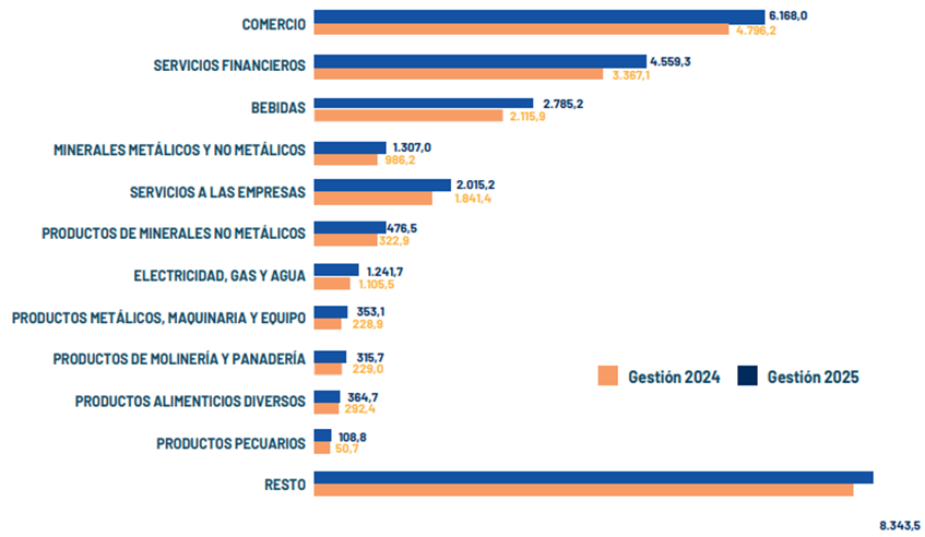 Diversas ramas productivas destacan por su notable expansión: la fabricación de Productos Metálicos, Maquinaria y Equipo creció un 54,3%; los Productos de Minerales no Metálicos aumentaron un 47,6%; y los Productos de Molinería y Panadería, un 37,8%, evidenciando una mayor demanda en el mercado interno. En particular, el sector pecuario mostró un alza extraordinaria, más que duplicando su aporte tributario con un incremento del 114,7%.