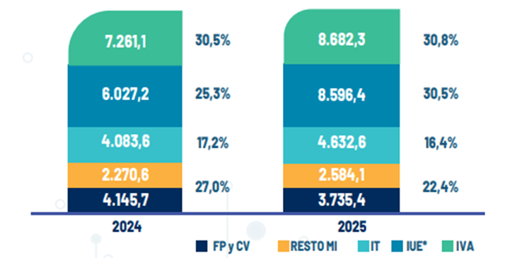 El Impuesto sobre las Utilidades de las Empresas (IUE) fue el que mostró mayor dinamismo, con un incremento del 42,6%, al pasar de Bs6.027,2 millones a Bs8.596,4 millones, lo que elevó su participación del 25,3% al 30,5%. Por su parte, el Impuesto a las Transacciones (IT) registró Bs4.632,6 millones, con una variación positiva del 13,4%, aunque su peso relativo disminuyó ligeramente del 17,2% al 16,4%.